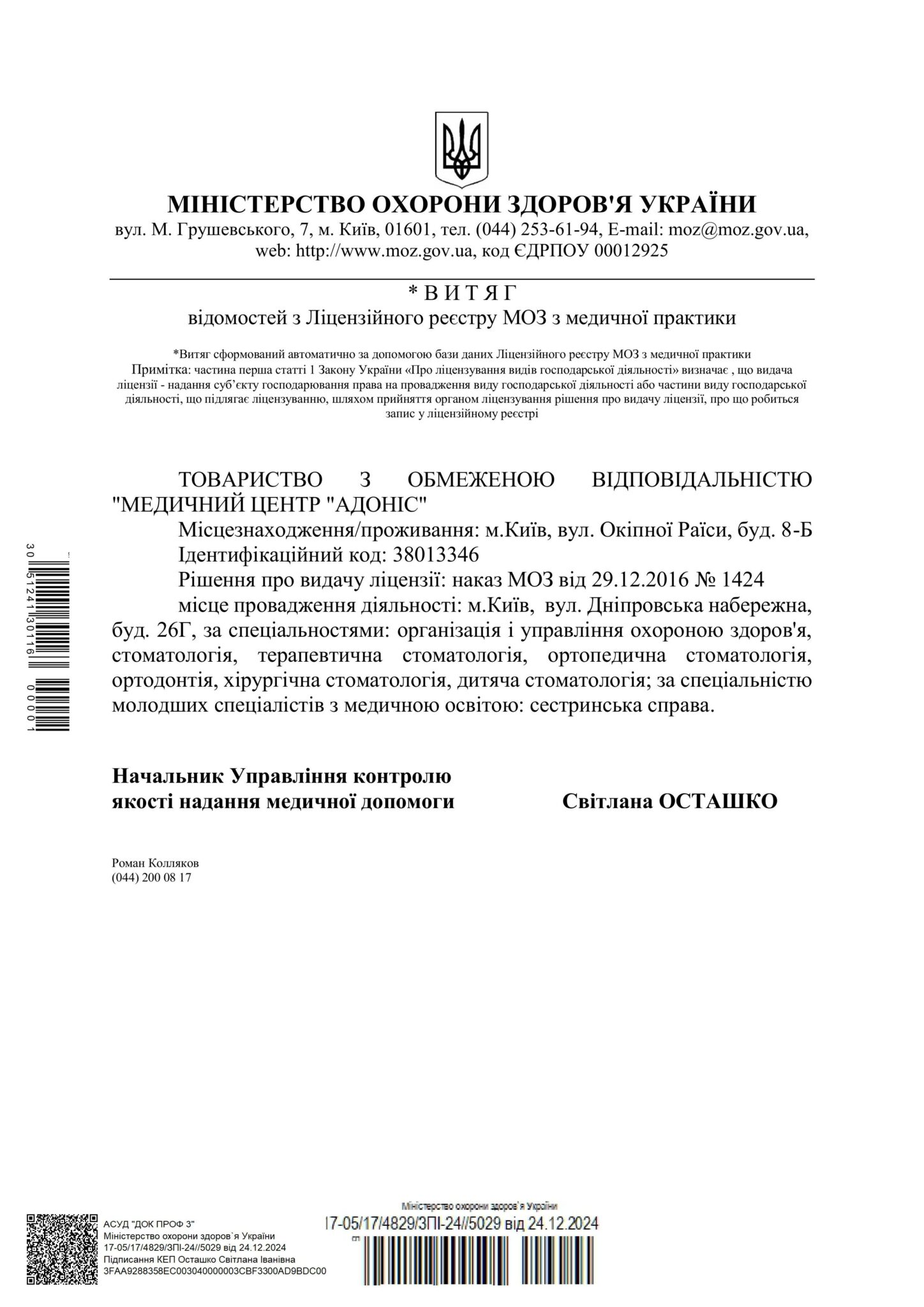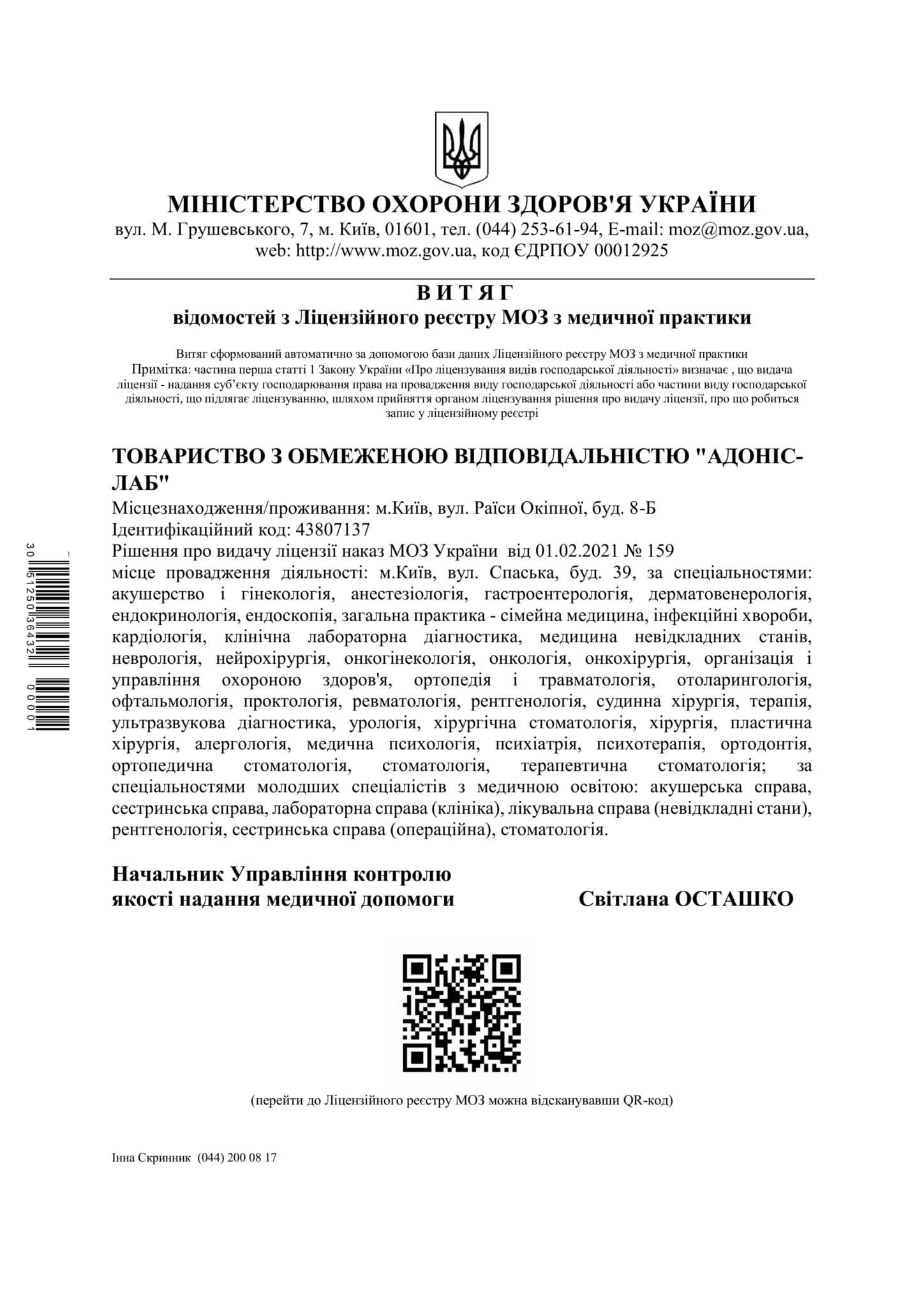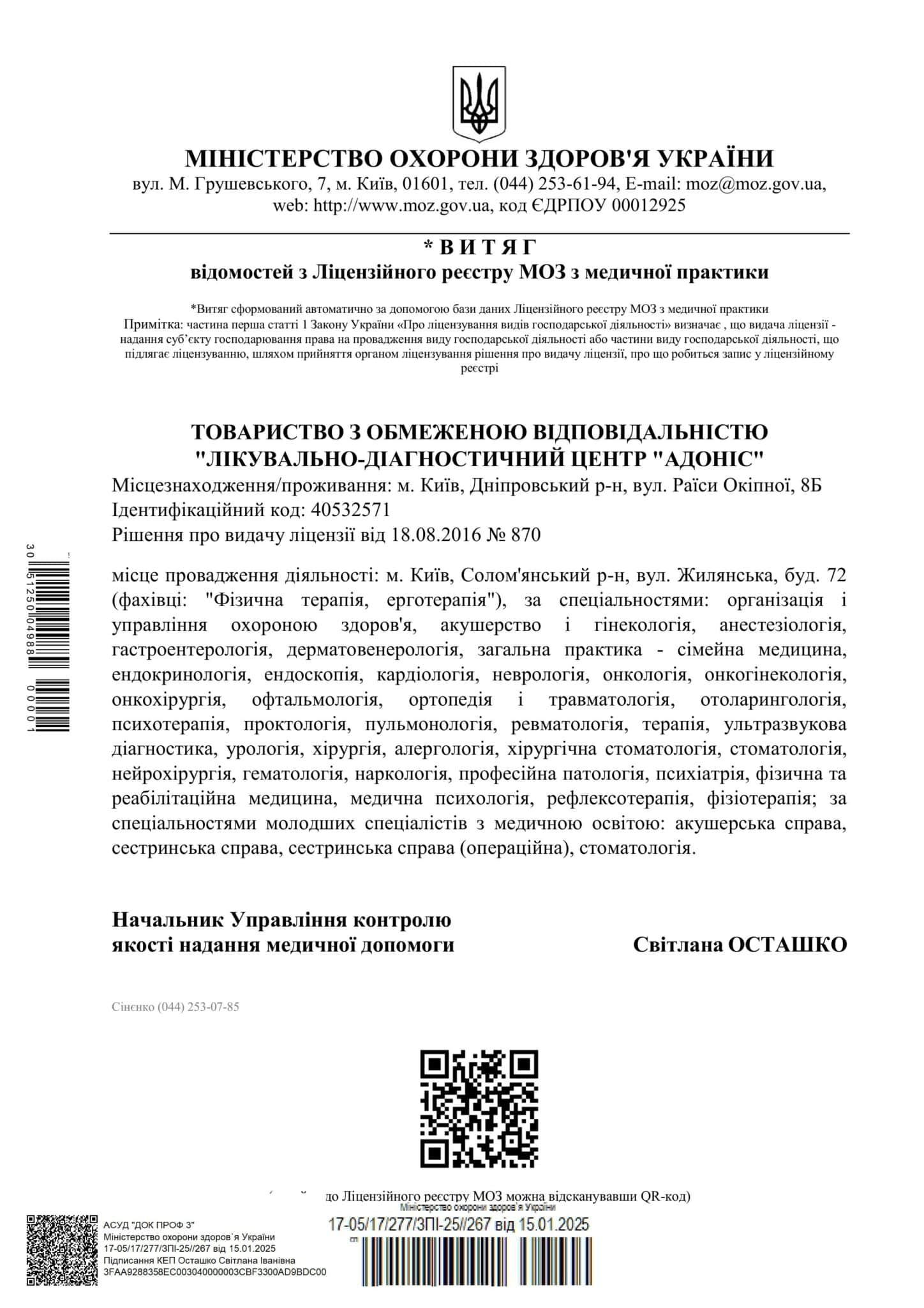 В филиале принимает более 80 квалифицированных врачей, среди которых кандидаты медицинских наук, ведущие специалисты, врачи высшей категории, средний стаж работы которых составляет более 15 лет. Центр Здоровья Семьи ADONIS FAMILY (м. Осокорки) оснащен диагностическим оборудованием экспертного класса и современной аппаратурой для проведения хирургического вмешательства и применения вспомогательных репродуктивных технологий.